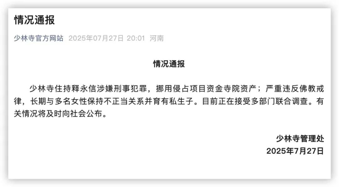 7月27日,少林寺管理处发布情况通报,少林寺住持释永信涉嫌刑事犯罪,挪用侵占项目资金寺院资产;严重违反佛教戒律,长期与多名女性保持不正当关系并育有私生子。目前正在接受多部门联合调查。有关情况将及时向社会公布。