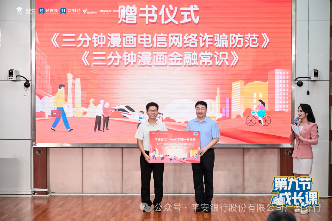 在活动致辞环节,华南理工大学附属实验学校校长范闽指出金融知识普及对青少年成长的重要性。平安银行广州分行副行长董国华表示将深化校银合作机制,通过每月定制化课程实现教育常态化。现场特别向学校捐赠了平安银行联合中国法治出版社出版的《三分钟漫画金融常识》《三分钟漫画电信网络诈骗防范》等漫画教材,以图文并茂的形式强化知识传播效果。