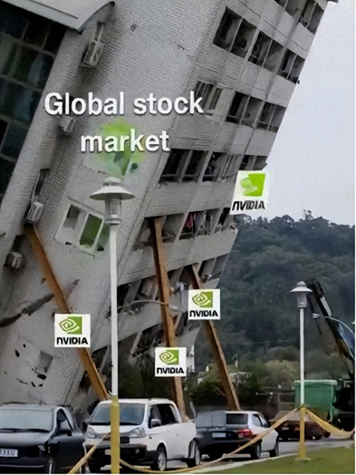 他还拿网上的梗图自嘲:全球股市就是一栋歪歪扭扭的大楼,全靠英伟达这几根 “顶梁柱” 硬撑着。做得差一点,就被骂是 AI 泡沫破了。