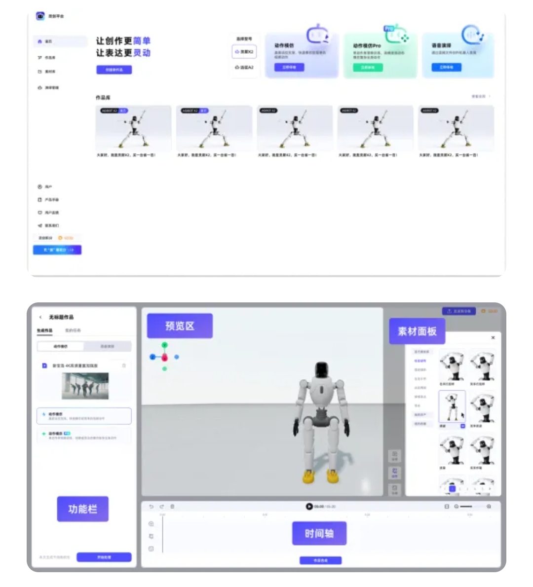 据了解,在该创作平台中,已集成了动作混剪、组合与故事线编排功能。用户可借助该功能,像剪辑视频一样对机器人的声音、动作与表情进行多轨道编排,并能够逐帧调整动作节奏,以生成流畅衔接的连续动作序列。