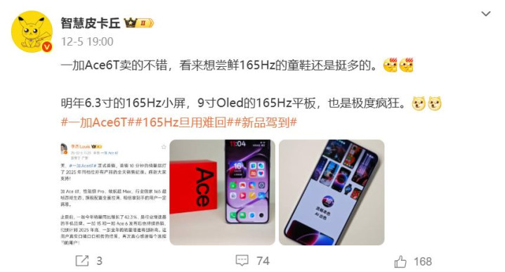 今年一加搞165Hz高刷效果不错,吸引了很多爱玩游戏的用户,同时把风驰游戏内核写入芯片底层,运行稳定性和流畅度更强,接下来的小屏手机、平板电脑都会用上165Hz高刷屏幕。