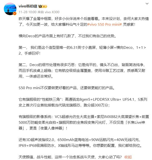 不过一加15T要明年三月左右才会上市,还需要等一等,近期却有一款小屏手机即将上市,就是预热已久的vivo s50 pro mini,虽然主打影像可性能上也给到旗舰水准,这款手机将于本月15日发布,算算时间也快来了,可以等一等,本期就来盘点这些小屏新机,朋友们可以了解下。