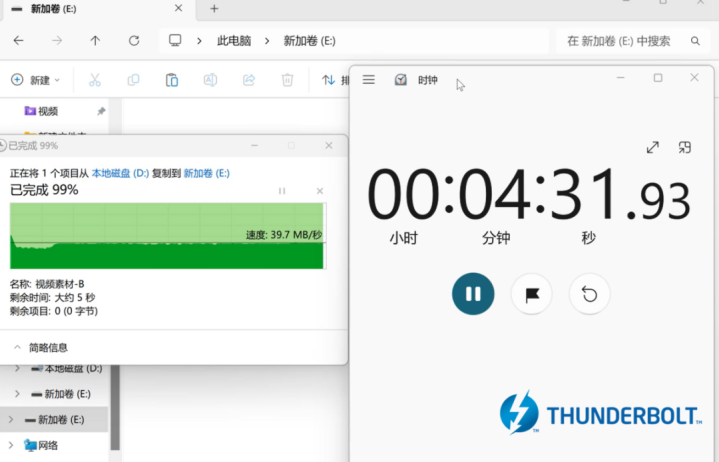 其中,宇瞻AS2280硬盘采用了PCIe4.0*4规格,搭载M.2接口,符合NVMe 1.3标准协议,最大传输读取速率可达5000MB/s,最大写入速率为4400MB/s;优越者S245B固态硬盘盒搭载了一个M.2接口的NVMe硬盘位,支持USB4传输协议,最大数据传输速率约为32Gbps,即理论最大读写速度为4000MB/s。