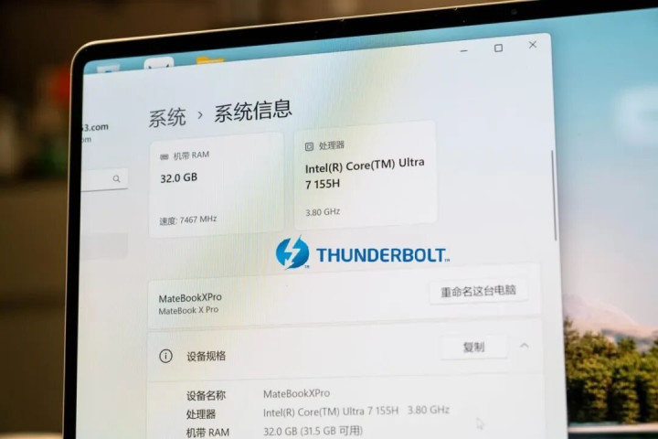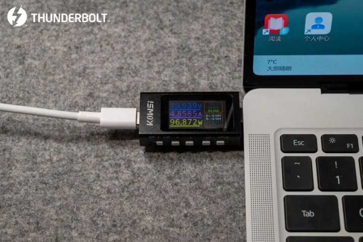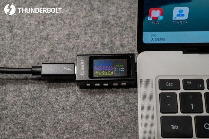 接下来是充电测试环节,本次我们采用的测试电脑为华为MateBook X Pro 2024款,电脑搭载了两个Intel®Thunderbolt™ 4接口,支持最高达100W的PD3.0协议充电功率。