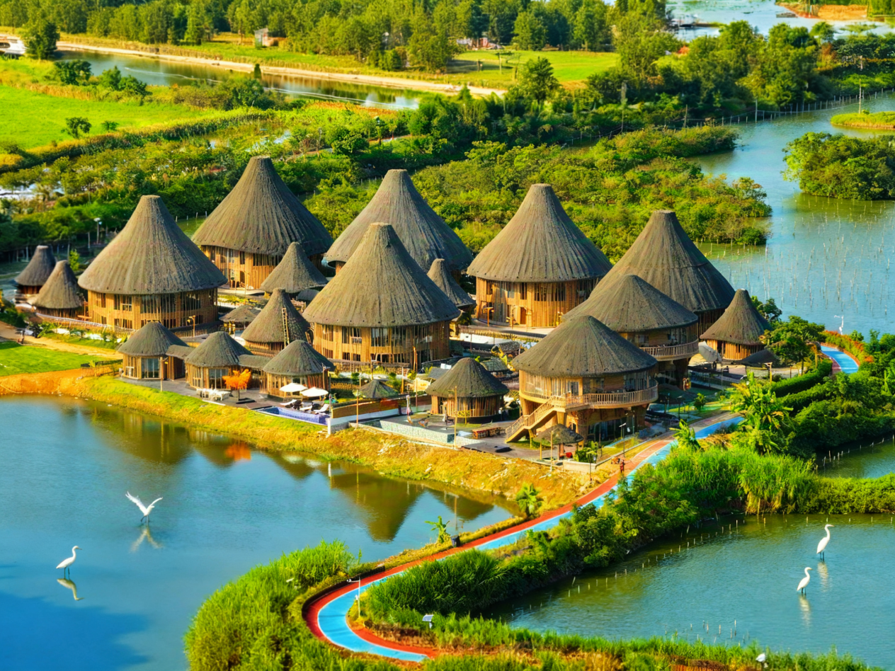 位于汕尾市大液河碧道旁的白鹭集度假村,野奢风格的建筑与湿地浑然一体。